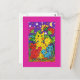 Diese drei farbenfrohen Katzen sitzen mitten in der Nacht in einem lebendigen Garten, umgeben von kleinen bunten Blume auf dem Boden und großen, lebhaften Blume über ihnen. Fireflies schwänzen und ein Halbmond glänzt in einem sternvollen lila Himmel.