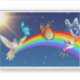 Nachthimmel, zwei Vögel, Schmetterlinge und ein lebhafter Regenbogen.