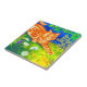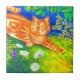 Tile mit Louis Wains Tiergemälde Cat Stalking (1860-1939). Eine orange gestreifte Katze geht nachts auf einem grünen Feld spazieren. Weiße, lila und rote Blume stehen im Vordergrund. Ein wunderbares Geschenk für Katzenliebhaber und englische Kunst.