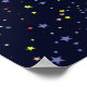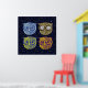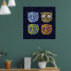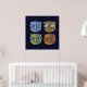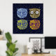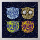 Vier grafische Eule-Illustrationen in einem strahlend blauen Himmel zur Dekoration Ihrer Zuhause Wände