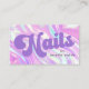 Trendy Visitenkarten mit Ihrem Namen und dem Text "Nails" in einem lila Retro-Schriftart auf einem gedruckten Hintergrund, der an falten Kunststoff in hellen Pastellfarben erinnert, und Kontaktinformationen auf der Rückseite.