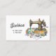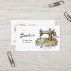 Geschäftskarte für Ihr Nähgeschäft, illustriert mit farbenfroher Vintage-Nähmaschine, Spulen und Nadeln. Eingestellt für Änderungen und Reparaturen, aber leicht zu bearbeiten und die Art der Projekte aufzulisten, für die Sie verfügbar sind. Flexibler Bereich für Kontaktdaten; soziale Medien, Adresse oder Telefon.
