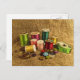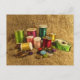 Diese farbenfrohe Postkarte zeigt die Werkzeuge des Seemanns. Helle Fässer aus Regenbogen in den Farben Grün, Rot, Rosa, Türkis, Gelb, Gold, Blau und Orange stehen neben einem Messband, Tischtennis, Tasten und Buttonen. Alle sind Set auf einem Bild eines braunen Einbruchmusters.