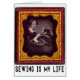 Das richtige Foto einer Viktorianischen Frau, die hart an ihrer "Staat-of-the-art" Nähmaschine arbeitet, zusammen mit einem lustigen Logo: Nähen ist mein Leben!