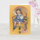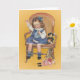 Vintages Kunstwerk eines kleinen Mädchens, das mit ihren Puppen in einem großen Schaukelstuhl sitzt und dabei durch Puppenkleidung das Nähen lernt