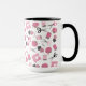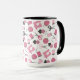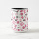 Eine Tasse, die einen nähenden themed Entwurf besteht einer Nähmaschine, Spulen des Fadens, einem Buttonkissen, Scheren, Gewebemustern und aus nähenden Nadeln kennzeichnet. Entwurf hat ein rosa Farbschema.