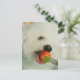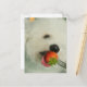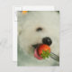 Nahes Aufgehen einer Bichon Frise, die eine Erdbee Postkarte