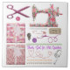 Eine Collage von genähten Stickereien. Nähmaschinen, Stoffe, Scheren, Faden, Knöpfe und Fettviertel.