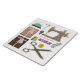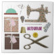 Eine Collage von nähenden thematischen Aufklebern. Nähmaschinen, Gewebe, Scheren, Faden, Knöpfe und Button-Kissen.