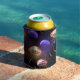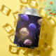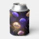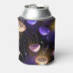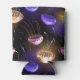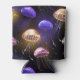 Nahtlose Muster heller, goldener, lila, künstlerisch gezeichnet, leuchtender Quallen auf schwarzem Meeresgrund. Glühende Quallen.