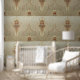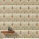 Ein sich wiederholendes Jugendstil-Design geometrischer Cartuches mit einer linearen Abstraktion der Blume. Durch längliche Fretchen verbunden mit einer kleineren ergänzenden Kartuche abwechselnd auf dem Boden und oben durch den Reben auf einem Boden, der dunkler wird in Richtung der Basis mit einer linearen Gesamtkonstruktion zwischen horizontalen Bandbreiten. Bedruckt in olivgrün, taupe, beige, bronze, gold und dunkelbraun