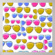 Nahtloses Muster mit bunten Retro-Aviator-Sonnenbrillen mit farbigen Gläsern. Sonnenbrille mit Vintager Illustration in Gelb, Rosa und Blau. Accessoires, Hintergrund, Blau, Farbe, cool, niedlich, Design, Element, Auge, Brille, Sehkraft, Stoff, Mode, Modeerscheinungen, Rahmen, Spaß, Funky, Glassvintage, Retro, Illustration,