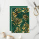 Nahtloses Muster aus Gold, Schmuck, glänzenden Farnzweigen und Blättern auf grünem, waldigem, texturiertem Hintergrund. Goldener Farn.