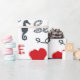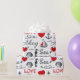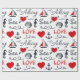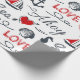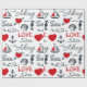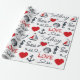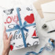 Seamloses Wassermuster mit Wasserzeichen (Segelboot, Anker, Wellen, Seepferd, Muschel) und roten Herzen mit Textdesign auf weißem Hintergrund