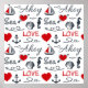 Seamloses Wassermuster mit Wasserzeichen (Segelboot, Anker, Wellen, Seepferd, Muschel) und roten Herzen mit Textdesign auf weißem Hintergrund