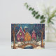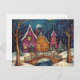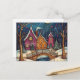 Eine skurrile naive Weihnachtsszene mit einer bezaubernden Bogenbrücke, die über einen sanft fließenden Bach überquert. Schneedecke, gemütliche Hütten, die im Hintergrund durch die Bäume gucken. Entlang des Wassers und in der Nähe der Brücke stehen große Weihnachtsbäume stolz, geschmückt mit bunten Bausteinen und bunten Lichtern. Die Szene leuchtet mit einem warmen, fröhlichen Urlaubssgeist.