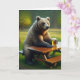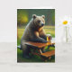 Großer Bär sitzt an einem Picknicktisch mit einer Tasse Bier für den Happy Name Day. Text ist bearbeitbar.