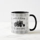 Eine wunderschöne, rustikale Tasse, zwei Töne Kaffee- mit Kunstwerken einer Vintagen Bauerntraktor-Silhouette mit Text-Lektüre "Willkommen in unserem Bauernhof" und Ihrem Familiennamen, feststehendem Datum oder anderen gewünschten Text. Dieses einzigartige Design Erholungen auf einem karierten Druck in Grau und Weiß. Um mehr Designs wie dieses zu sehen, besuchen Sie bitte meinen Shop hier unter "Zazzle.com/Rustic_Charm". Danke.