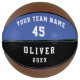 Benutzerdefiniertes Basketball Blau mit der Spielerteams-Name-Nummer. Modernes und einfaches Design in dunkelblauen und schwarzen Farben. Der Text ist in weißer Farbe. Personalisieren Sie es mit Ihrem Teamnamen, Spielernummer, Spielernummer, Spielername und Jahr. Ein toller Sake, um sich an Ihren Lieblingssport zu erinnern und ein perfektes Geschenk für einen Basketballspieler, Teamkollegen, Trainer, Freunde und Familie.