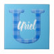 Name der Jungen mit Buchstabe U initial. Blaues kariertes Musterbild. Dekorative Keramik Fliesen für Kinderzimmer. Text kann bearbeitet werden, um diese Kachel einzigartig zu machen.