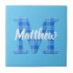 Name der Jungen mit dem Buchstaben M initial. Blaues kariertes Musterbild. Dekorative Keramik Fliesen für Kinderzimmer. Text kann bearbeitet werden, um diese Kachel einzigartig zu machen.