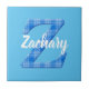 Name der Jungen mit Buchstabe Z anfänglich. Blaues kariertes Musterbild. Dekorative Keramik Fliesen für Kinderzimmer. Text kann bearbeitet werden, um diese Kachel einzigartig zu machen.