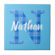 Name der Jungen mit Anfangsbuchstaben N. Blaues kariertes Musterbild. Dekorative Keramik Fliesen für Kinderzimmer. Text kann bearbeitet werden, um diese Kachel einzigartig zu machen.