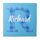 Name der Jungen mit Buchstabe R Initial. Blaues kariertes Musterbild. Dekorative Keramik Fliesen für Kinderzimmer. Text kann bearbeitet werden, um diese Kachel einzigartig zu machen.