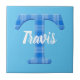 Name der Jungen mit dem Buchstaben T initial. Blaues kariertes Musterbild. Dekorative Keramik Fliesen für Kinderzimmer. Text kann bearbeitet werden, um diese Kachel einzigartig zu machen.