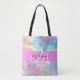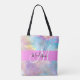 Girly Regenbogen holografische irisierende Monogramm Name und erste Tote Tasche. Individuelle Name und Monogramm sind in einem handgeschriebenen, eleganten Skript mit rosa Hintergrund geschrieben. Ein perfektes Geburtstag- oder Weihnachtsgeschenk!