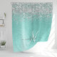Dieses trendige Design mit schicken Duschvorhängen und hübschem silberglänzenden Glitzer auf aquamarinem, gebürstetem metallischem Hintergrund ist einfach zu personalisieren.
