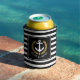 Eine Personalisierte Can Cooler mit Ihrem Bootsnamen, Familiennamen oder anderen gewünschten Texten. Mit eigens dafür entworfenen nautischen Bootsankern, goldenen Blätter und Sternemblem auf schwarz-weißen Streifen. Macht ein großartiges Geschenk für jeden Anlass.