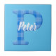 Name der Jungen mit dem Buchstaben P initial. Blaues kariertes Musterbild. Dekorative Keramik Fliesen für Kinderzimmer. Text kann bearbeitet werden, um diese Kachel einzigartig zu machen.