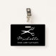 Abzeichen für Friseur und Friseur. Klassische Skripttypografie und benutzerdefinierte Hintergrundfarbe. Elegantes Design für Friseur, Friseur, Friseur, Friseur, Mitarbeiter, Mitarbeiter, Personal, Personal, Mitarbeiter etc. Berufliche Friseurschere Silhouette Logo. Fügen Sie Ihren eigenen Geschäftsmotto oder Firmennamen hinzu. Schwarz/Weiß oder Sonderfarben.