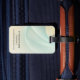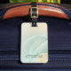 Gepäckanhänger mit Ihrem Namen in einem modernen Skript-Schriftart auf einem Hintergrund mit hellblau und goldgelb wirbelnden Linien.