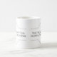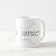 Tasse des Hotels in Schwarz, Grau und Weiß. Stilvolle weiße Tasse mit Hotelnamen in einem puristischen Stil mit minimalistischer Dekoration. Ändern Sie die Formulierung, um die Beispielaussage durch Ihre eigene Hotelname Auswahl zu ersetzen.