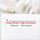 Dieses Label-Design beinhaltet die Anfrage "Bitte überprüfen, unterschreiben und zurückgeben", zusammen mit einer Signatur und einem personalisierten Lehrernamen. Sie könnte beispielsweise von einem Lehrer verwendet werden, um von einem Elternteil oder Vormund eine Überprüfung zu verlangen und die Marke anzuerkennen, die ein Kind bei einem Auftrag erhalten hat.