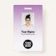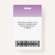 Dieses Abzeichen für die persönliche Personalnummer eines Mitarbeiters kann leicht mit Foto, Scan-Bar oder Qr-Code und Geschäftslogo personalisiert werden, wobei der Farbverlauf für die Hintergrundfarbe weiß ist. Einfaches Business-Design in hellpastellfarbenem Lavendel, lila und weiß mit einem Obrè-Overlay, vollständig in jeder Farbe in Vorder- und Rückengröße anpassbar, serifenlos einfache und moderne Schriftart und ein berufliches, elegantes und klares Aussehen. Die Abzeichen sind mit Lanyard, Metallklammer oder mit Retraktikett erhältlich. Keine Mindestbestellung.