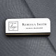 Weißes Namensschild mit einem schwarzen und goldenen Farbverlauf (Farbverlauf, nicht echte Folie) am unteren Rand und Ihrem individuelle Name und Titel. Laden Sie Ihr eigenes Logo hoch und erstellen Sie Namensmarken für Ihr Unternehmen oder Ihre Veranstaltung. Mit dem Designwerkzeug können Sie Schriftart und Farben ändern.