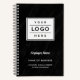 Fügen Sie Ihrem Arbeitsbereich einen beruflichen Look hinzu mit einem speziell für Ihr Firmenlogo geeigneten Spiralnotebook, das einen großen Platz für Ihr Firmenlogo mit modernem, individuellem Text bietet, der mit dem Namen des Mitarbeiters oder Geschäftsinhabers, dem Firmennamen, dem Standort, dem Slogan, der Website oder anderen Informationen personalisiert werden kann. Ein großartiges Geschenk für Unternehmen. Enthält ein Imitat schwarzer Carrera-Marmorhintergrund, der auf der Vorder- und Rückseite aufgedruckt ist.