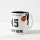 Moderne Basketball-Mannschaft Name Nummer Zwei-Tone-Kaffee-Tasse. Das Design hat eine schwarze Silhouette eines Basketballspielers mit einem Basketball. Der Text ist in modernen Schriftart - personalisieren Sie ihn mit Ihrem Teamnamen, Spielernummer und Spielername. Ideal für Basketballspieler.