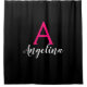 Personalisierter Gürtel mit schwarzem Duschvorhang aus Monogramm und Glam mit weißer und heißrosa Schrift. Dieser glamouröse Duschvorhang kann leicht mit Ihrem eigenen Vornamen und Monogramm Initial personalisiert werden. Sie können sogar die Textfarbe und den Stil des Schriftartes mit der Option Anpassen ändern.