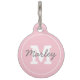Moderne Begleiter-ID-Tags mit pastellrosa Hintergrund, Hundestart, Name und Telefonnummer auf der Rückseite.