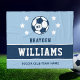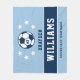 Personalisierte Fußball-Fleecedecke für Fußballspieler, wenn sie keine Tore auf dem Feld schießen, und für ihre Eltern, ihre Kinder zu unterstützen und bei kalten Spielen warm bleibe! Ein einzigartiges Teamgeschenk für Reiseturniere. Das Design umfasst einen Fußball, der mit der einheitlichen Spielernummer des Spielers abgestimmt ist, einen benutzerdefinierten Text für den Vor- und Nachnamen des Spielers und einen modernen Text für den Namen der Fußballmannschaft. Das stilvolle und moderne Design besticht durch eine sportliche Auswahl an Jersey-Schriften und einfache horizontale Streifen mit Sternakzenten. Das Farbschema von hellblau, marineblau und weiß kann so geändert werden, dass es mit den Teamfarben abgestimmt wird.