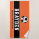 Das personalisierte Strandhandtuchdesign für Kinder und Jugendliche mit Fußball ist mit einer einheitlichen Spielernummer, einem benutzerdefinierten Text für den Vor- oder Nachnamen des Spielers und einem modernen Text für den Namen der Fußballmannschaft ausgestattet. Macht ein einzigartiges Gunstgeschenk für Turniere und Pool-Party mit dem Team! Das stilvolle und moderne Design besticht durch eine sportliche Varianz aus Jersey-Schriften und einfache horizontale Streifen. Das Farbschema von orange, schwarz und weiß kann so geändert werden, dass es mit den Teamfarben abgestimmt wird.