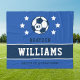 Personalisierte Fußball-Fleecedecke für Fußballspieler, wenn sie keine Tore auf dem Feld schießen, und für ihre Eltern, ihre Kinder zu unterstützen und bei kalten Spielen warm bleibe! Ein einzigartiges Teamgeschenk für Reiseturniere. Das Design umfasst einen Fußball, der mit der einheitlichen Spielernummer des Spielers abgestimmt ist, einen benutzerdefinierten Text für den Vor- und Nachnamen des Spielers und einen modernen Text für den Namen der Fußballmannschaft. Das stilvolle und moderne Design besticht durch eine sportliche Auswahl an Jersey-Schriften und einfache horizontale Streifen mit Sternakzenten. Das Farbschema von Royalblau, Marineblau und Weiß kann so geändert werden, dass es mit den Teamfarben abgestimmt wird.