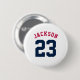 Personalisiertes sportjersey-Abzeichen mit weißer Hausnummer und Namen in Retro-70er Jahren Design-Stil in rot und blau auf weiß, für Sportteams oder als Geburtstag-Abzeichen.
