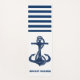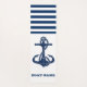 Dieses Bild zeigt einen Bootsnamen und einen Anker auf einem marineblau-blau-weiß gestreiften Hintergrund.