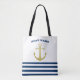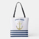 Dieses Bild zeigt einen Bootnamen und Anker auf einem marineblau-blau-weiß gestreiften Hintergrund.