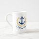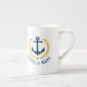 Eine Personalisierte Knochen-China Tasse mit Ihrem Bootsnamen, Familiennamen oder anderen gewünschten Text. Mit eigens dafür entworfenen nautischen Bootsankern, goldenen Blätter und Sternemblem. Macht ein großartiges Geschenk für jeden Anlass.